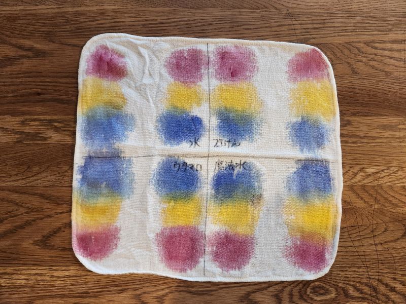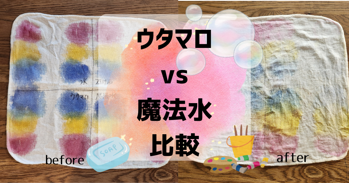 予想通り水はほとんど落ちなかったですね💧やはり水彩絵の具落としには、アルカリ性の石鹸タイプが、コスパも使い勝手もよくておすすめですウタマロ石鹼は漂白成分が入っているので、色柄ものには不向きですが、雑巾などの白い衣類には抜群の効果がでました!✨反対に魔法水は準備物も多いし手間もかかるので、個人的にはあまりおすすめしません